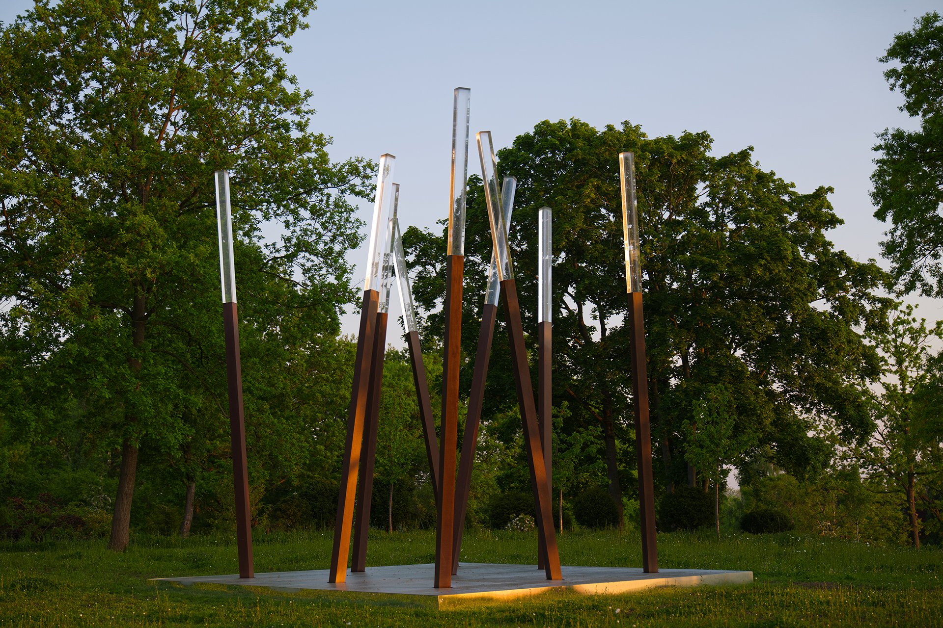 Jede einzelne Stele der Skulptur 9 Binome 80°–85° misst 6 Meter in der Höhe. Die Binome sind abwechselnd geneigt. Die Winkel der Neigungen variieren schrittweise zwischen 80° und 85° Grad. Das Werk folgt strengen mathematischen Grundsätzen. Die klassischen Regeln der Statik unterläuft es aber mit Rhythmus und Dynamik. Angesichts der monumentalen Dimensionen ist die reine, minimale Abstraktion dieser Skulptur staunenswert. Sie gehört mit der Verbindung zweier unterschiedlicher Materialien, Plexiglas und Cortenstahl, zur Werkgruppe der Binome. Ihr widmet sich Vera Röhm seit den 1970er Jahren bis heute.