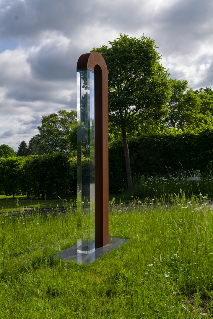 Auffällig an diesem Bogentor ist die Bogenkrümmung. Der enge Winkel verhindert, dass das Tor durchschritten werden kann. Die Aufmerksamkeit wird auf die physische Präsenz des Objekts selbst und auf die Formensprache des Runden gelenkt. Diese thematisiert jedoch nicht die geometrische Form des Kreises gegenüber der Geraden. Vielmehr ist auf das planetarische Modell mit seinen elliptischen Bahnen zu verweisen. Das Interesse gilt den universalen Zusammenhängen der Natur, des Kosmos und des Lichts – für Sternbilder, Kuppeln, Mondphasen – und ihren physikalischen Gesetzen. Mit dem Bogentor zeigt Vera Röhm ein Werk aus einer neuen Serie innerhalb der Binome.