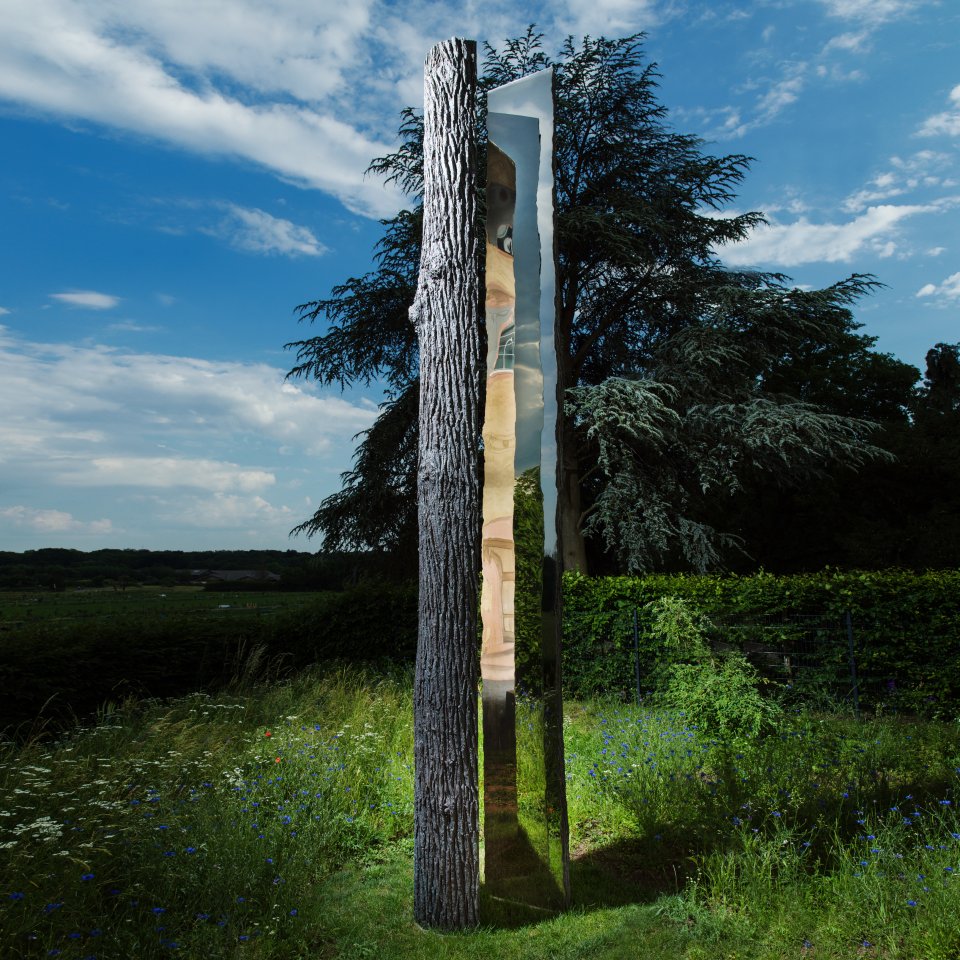 Mit bis zu vier Blitzlichtaggregaten und seiner Hasselblad-Kamera ausgerüstet nimmt Carsten Costard Skulpturen aus dem öffentlichen Raum auf. Zu sehen sind diese noch bis zum 16. Juli im Skulpturengarten Spanischer Turm auf der Darmstädter Rosenhöhe im Rahmen der Ausstellung »Carsten Costard PAINTED BY LIGHT«. Am vergangenen Freitag, 9. Juni 2023, hat der in Mainz geborene und inzwischen in Darmstadt lebende Architektur- und Industriefotograf seine Technik vor interessierten Besucherinnen und Besuchern demonstriert. Costard ging dabei nicht nur auf die Technik selbst ein, sondern fotografierte exemplarisch auch den »Spiegelbaum« von Vera Röhm, der seit 2022 im Skulpturengarten Spanischer Turm steht (siehe Foto oben).