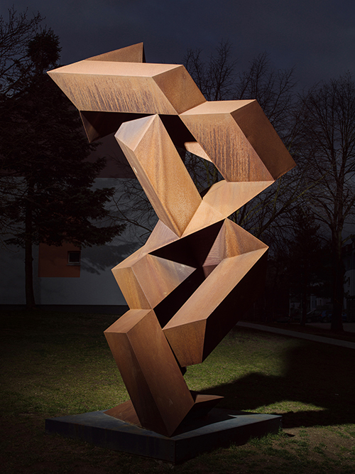 Wie bei dem in der Ausstellung »Carsten Costard PAINTED BY LIGHT« gegenüberstehenden »Hammerrad«, dass die Technische Universität Darmstadt 2017 erworben und auf dem Campus Lichtwiese aufgestellt hat, ist die typische Arbeitsweise des Künstlers mit geometrischen Formen klar erkennbar.